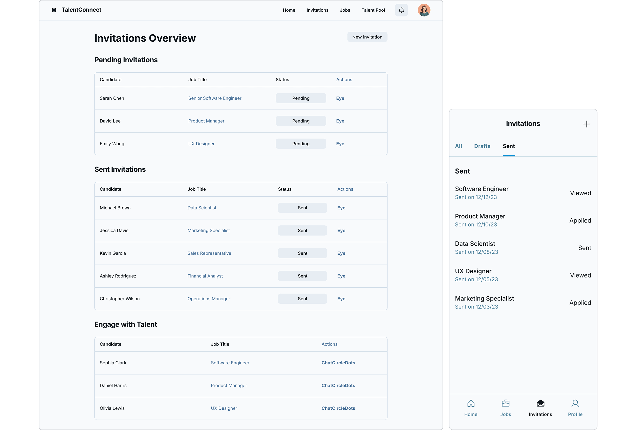 “As an enterprise user, I want to invite selected talent members to apply for specific job openings in my ATS/CRM So that I can engage qualified candidates and track their application journey from invitation to application and beyond”