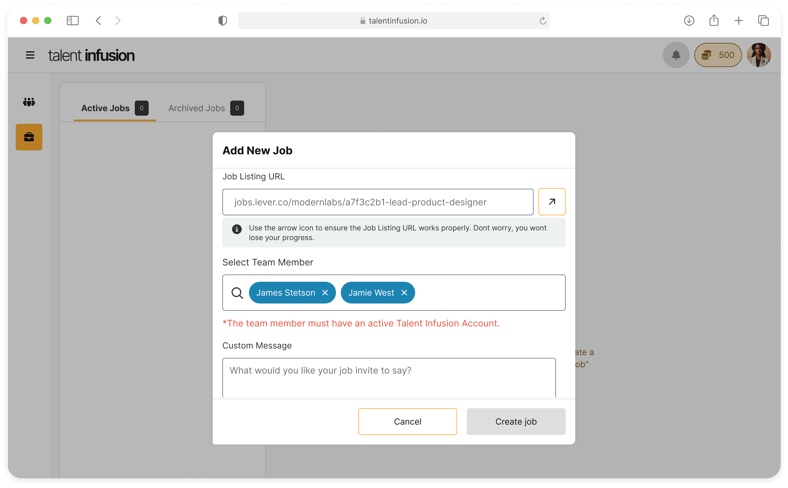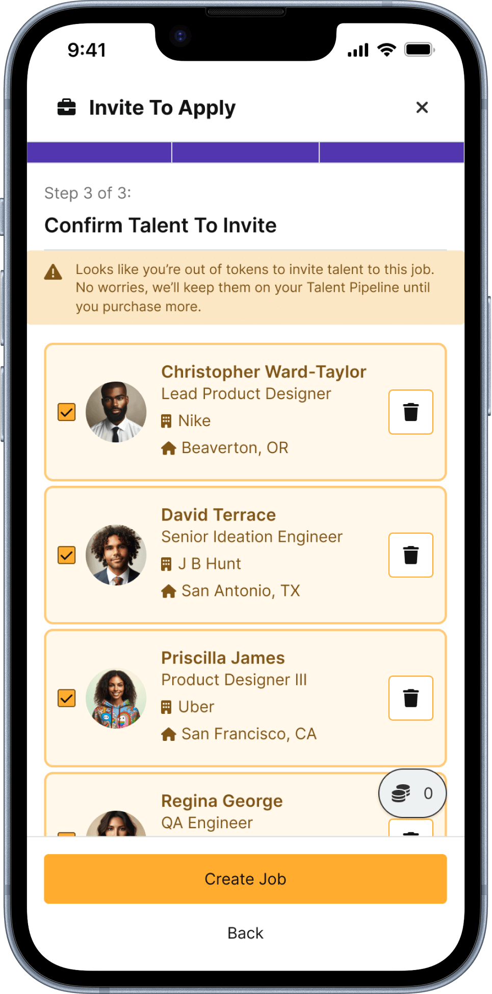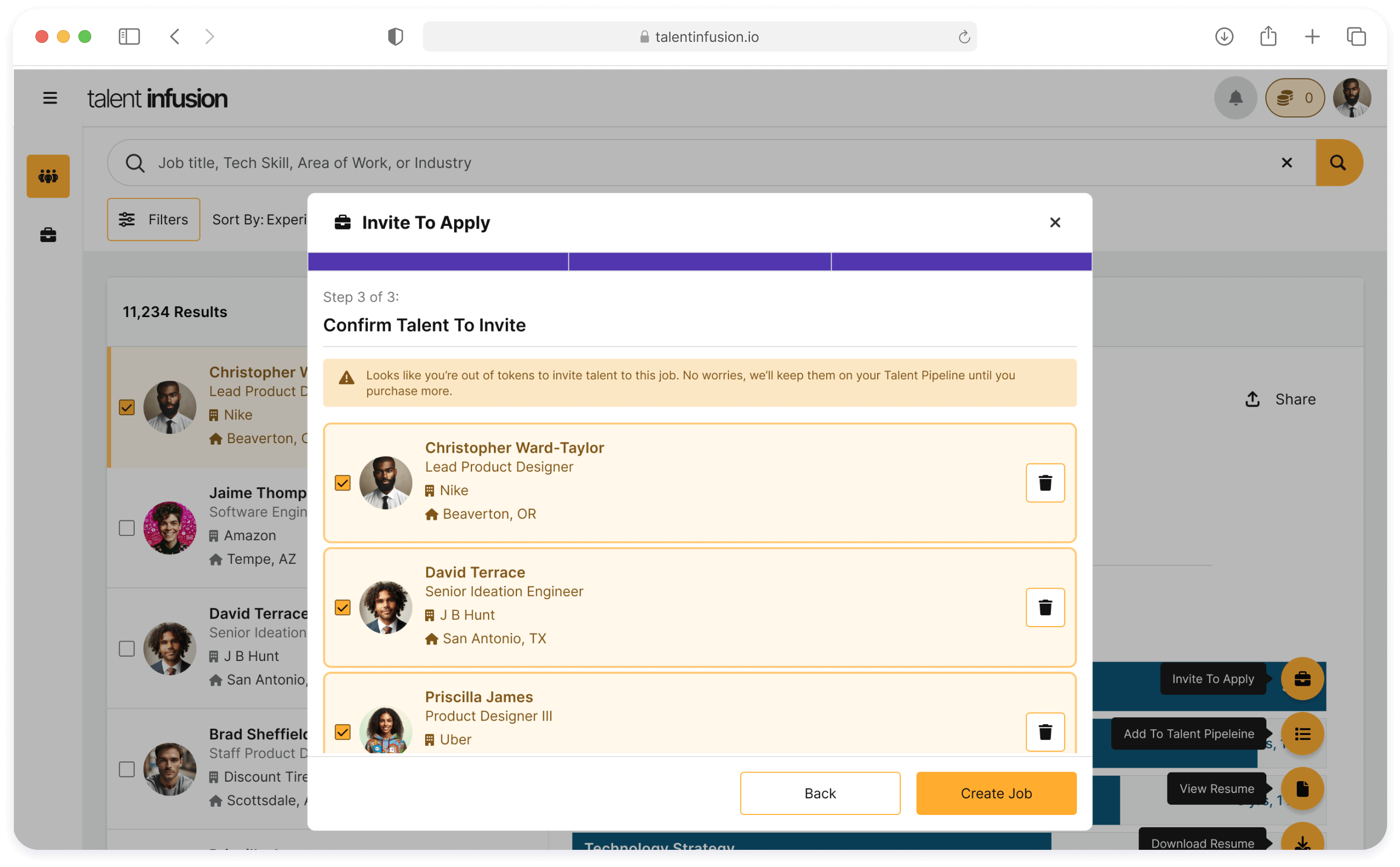 Use Case: The enterprise user is creating a new job but has limited tokens and cant successfully invite all of the selected talent