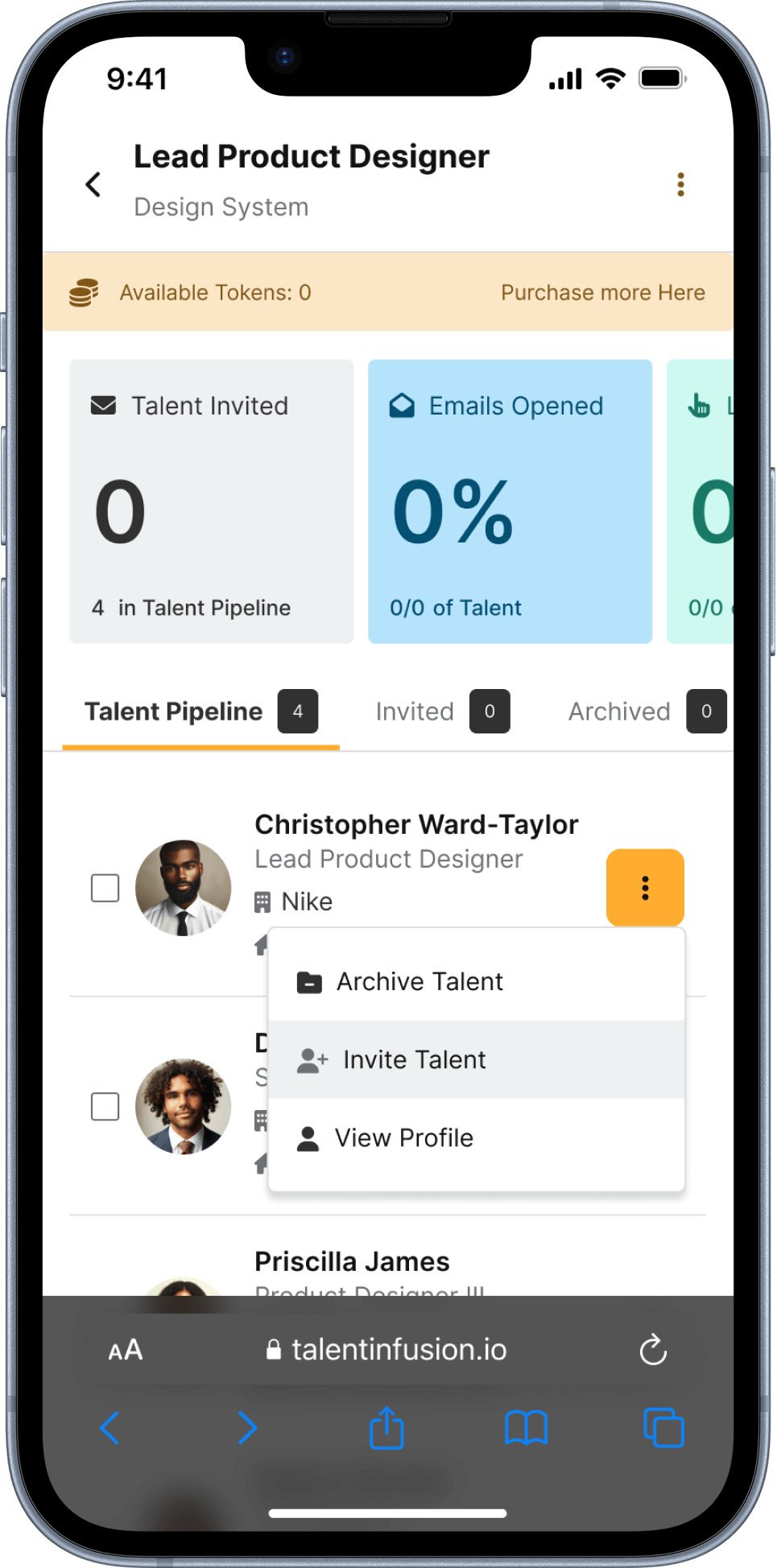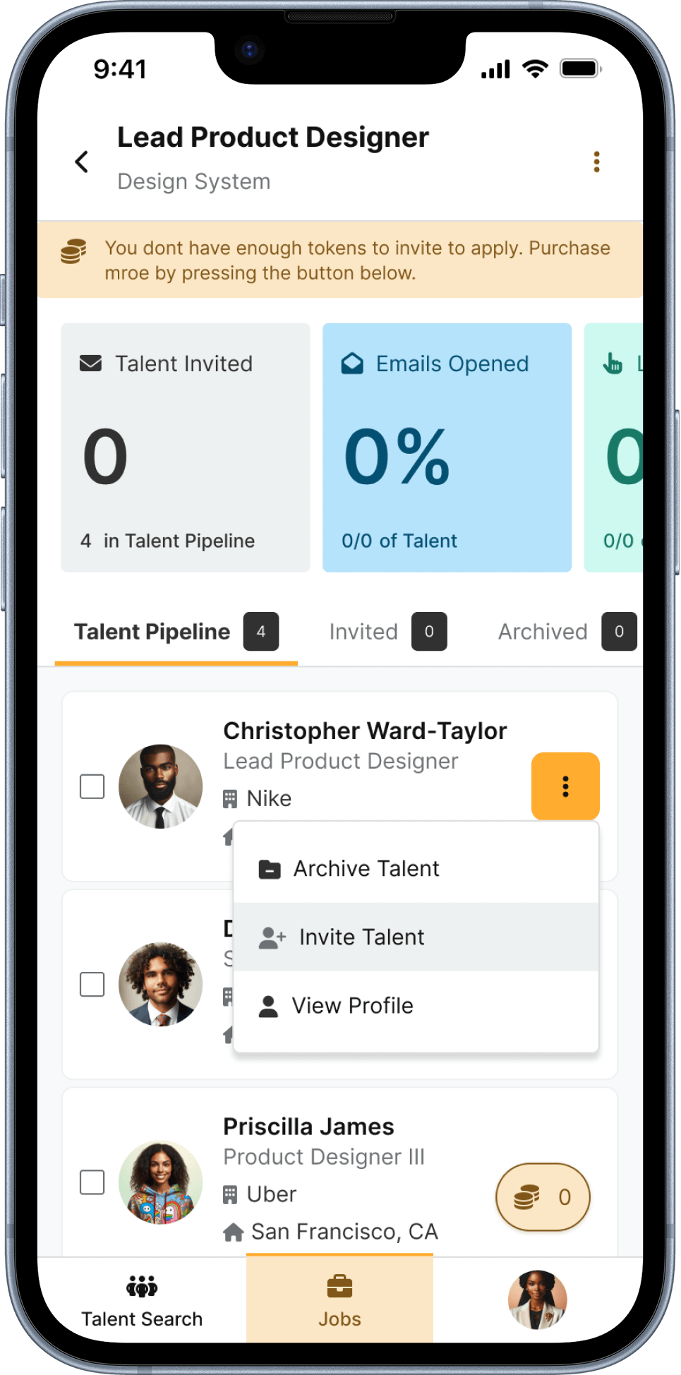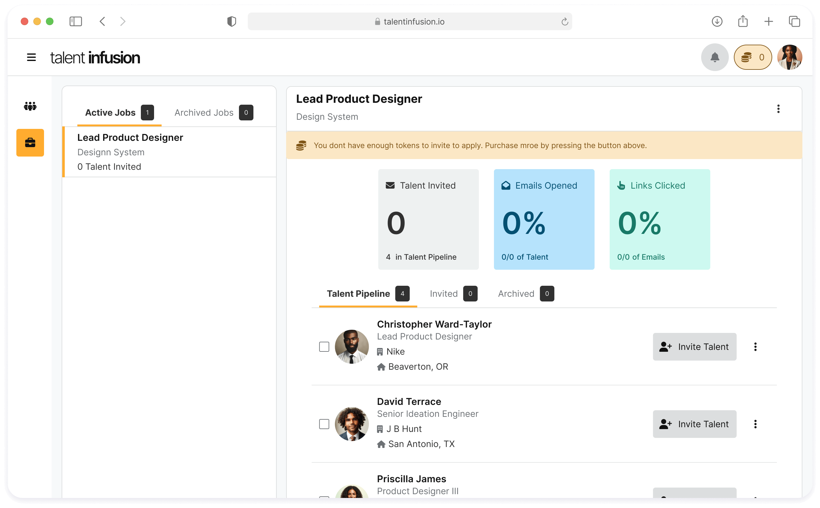 Use Case: An enterprise user attempts to invite talent who has been placed in the pipeline, but their account has no tokens to proceed.